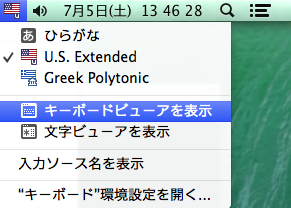 - 画面右上の入力モード(「あ」など)で「"キーボード"環境設定を開く」(「"ことえり"環境設定を開く」「"日本語"環境設定を開く」などの場合もあります).